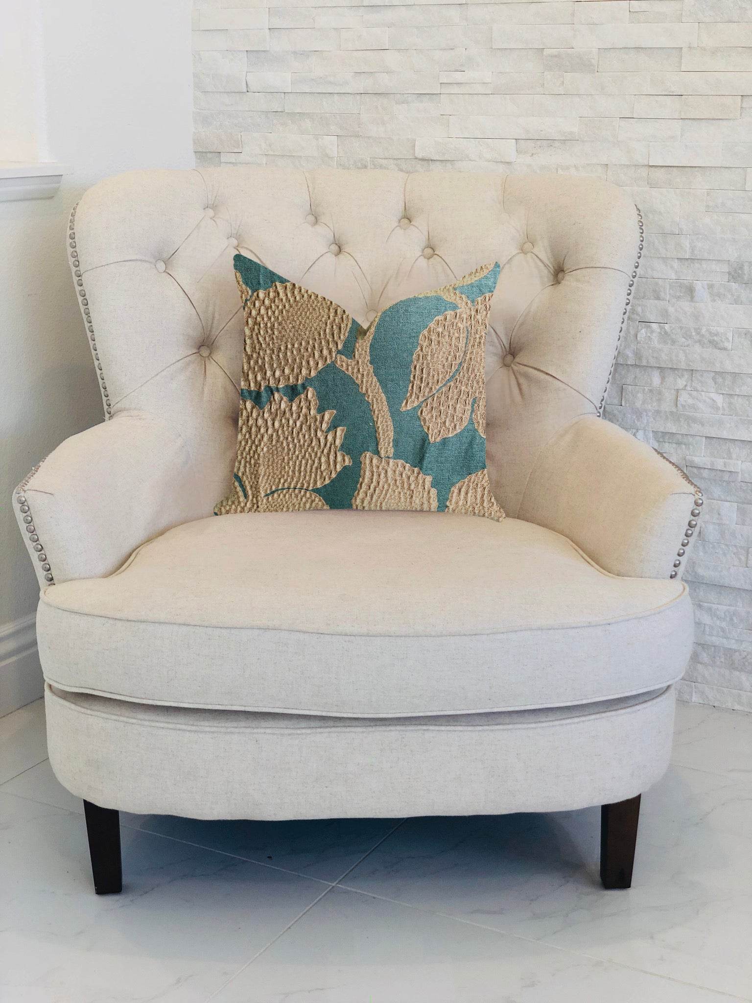 Every pillow is handmade in the USA with a focus on craftsmanship. It’s double-sided for full visual impact, finished with an invisible zipper for a seamless look, and stitched with reinforced seams for lasting strength. Inside, a hypoallergenic down-alternative insert provides the loft and softness that make it as comfortable as it is beautiful.