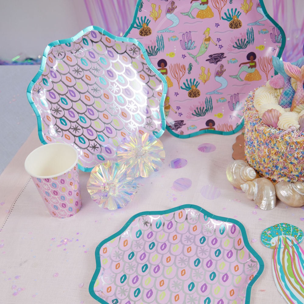 Transform your celebration into a mystical undersea kingdom with our Mesmerizing Mermaid Party Supplies Box. Adorn your table with this magical assortment, featuring whimsical cups sprinkled with teal and sparkling foils reminiscent of a mermaid's shimmering scales.